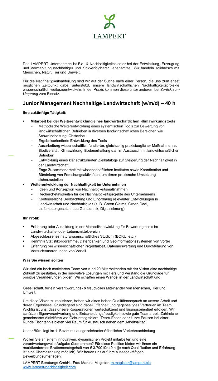 Junior Management Nachhaltige Landwirtschaft (w/m/d)